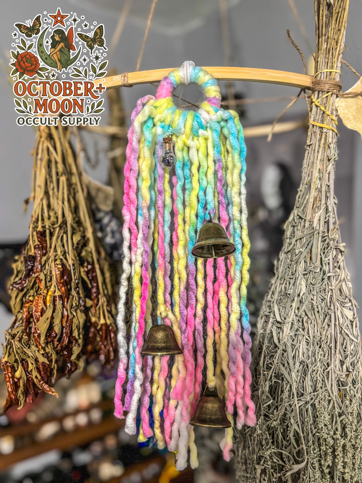 These witch bells come with 3 bells and a lavender spell jar to help protect against bad dreams. Perfect for the kiddos bedroom!